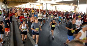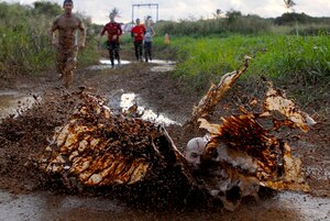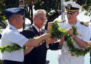 Gary Sinise, actor and musician, and Greg McMackin, university of Hawaii head football coach, spoke to Hickam Airmen during the Wingman Day commnader's call Jan. 29 in Hangar 19 about leadership philosophies and thanked them for serving their country. Coach McMackin took time out of a hectic