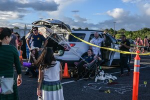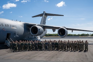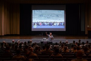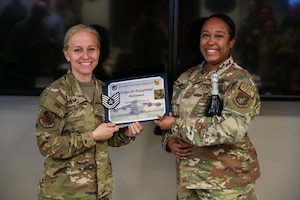Col. Michele Lo Bianco, 15th Wing commander, presents Staff Sgt. Katherine Johnson, 647th Force Support Squadron force management noncommissioned officer in-charge, with a certificate during a Stripes for Exceptional Performers promotion ceremony at Joint Base Pearl Harbor-Hickam, Hawaii, Oct. 19,