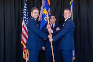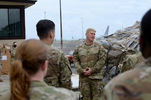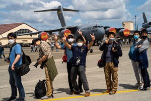 Col. Daniel Dobbels, 15th Wing commander, and his family celebrate together after his final flight on a C-17 Globemaster III at Joint Base Pearl Harbor-Hickam, Hawaii, June 15, 2022. Dobbels and his family celebrated the end of their 24-year-old Air Force journey. (U.S. Air Force photo by Staff Sgt.