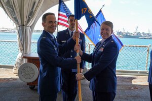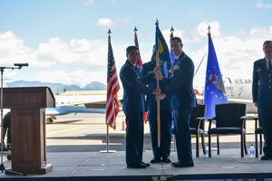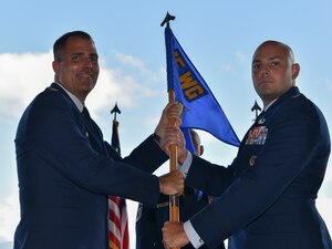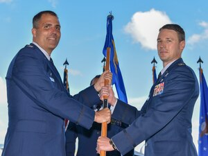 Col. Garrett Fisher, assumes command of the 15th Operations Group by accepting the guidon from Col. Daniel Dobbels, 15th Wing commander, during the 15th OG change of command ceremony at Joint Base Pearl Harbor-Hickam, Hawaii, July 9, 2021. Established in April, 1992, as part of the objective wing