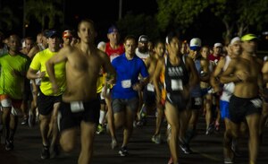 Runners take off at the start of the 11th Annual Hickam Half Marathon, Joint Base Pearl Harbor-Hickam, Hawaii, Aug. 19, 2017. The yearly event is hosted by the Morale, Welfare and Recreation office to promote fitness and health. (U.S. Air Force photo by Tech. Sgt. Heather Redman)