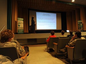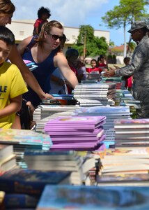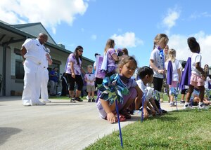 Captain Stanley Keeve, Jr., commander Joint Base Pearl-Harbor Hickam and Command Master Chief Jack Johnson, Joint Base Pearl-Harbor Hickam watches as students plant pinwheels at the Center Drive Child Development Center on Joint Base Pearl-Harbor Hickam, Hawaii, April 15, 2016. Children, parents and