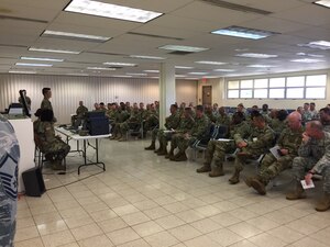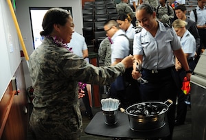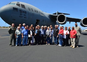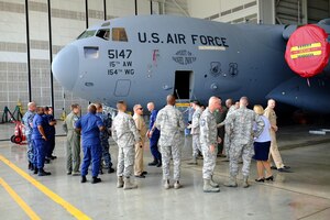 Members of the 15th Wing and Friends of Hickam stand in front of a C-17 Globemaster III during a base tour on Joint Base Pearl Harbor-Hickam, March 31, 2016. The tour highlighted some of the 15th Wings agencies including Security Forces, Explosive Ordines Disposal, Maintenances and the 15th Medical