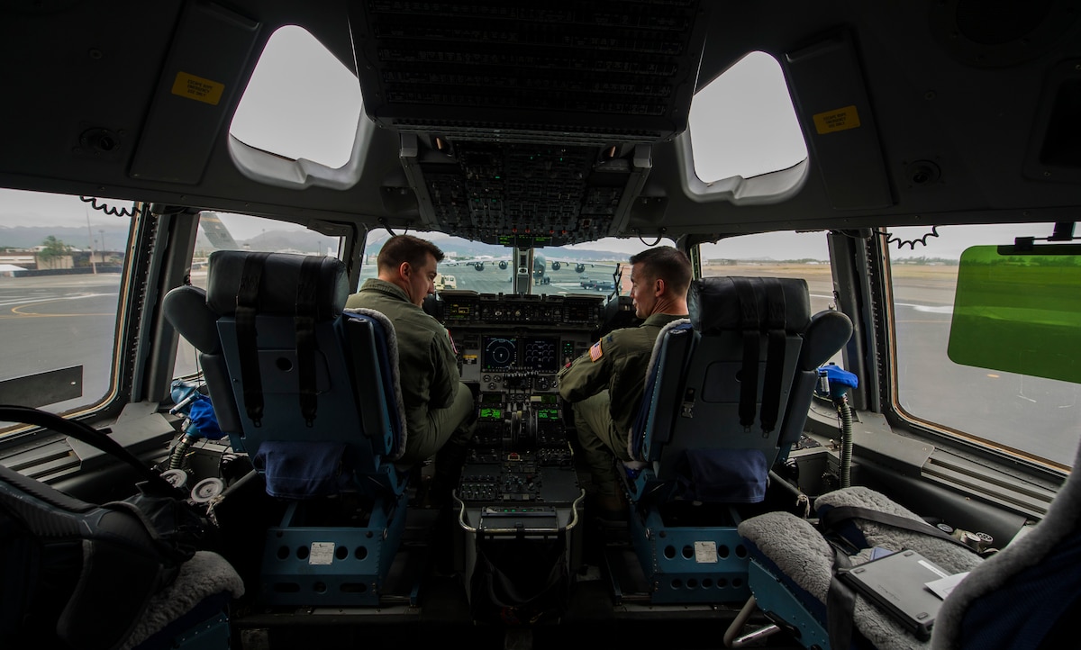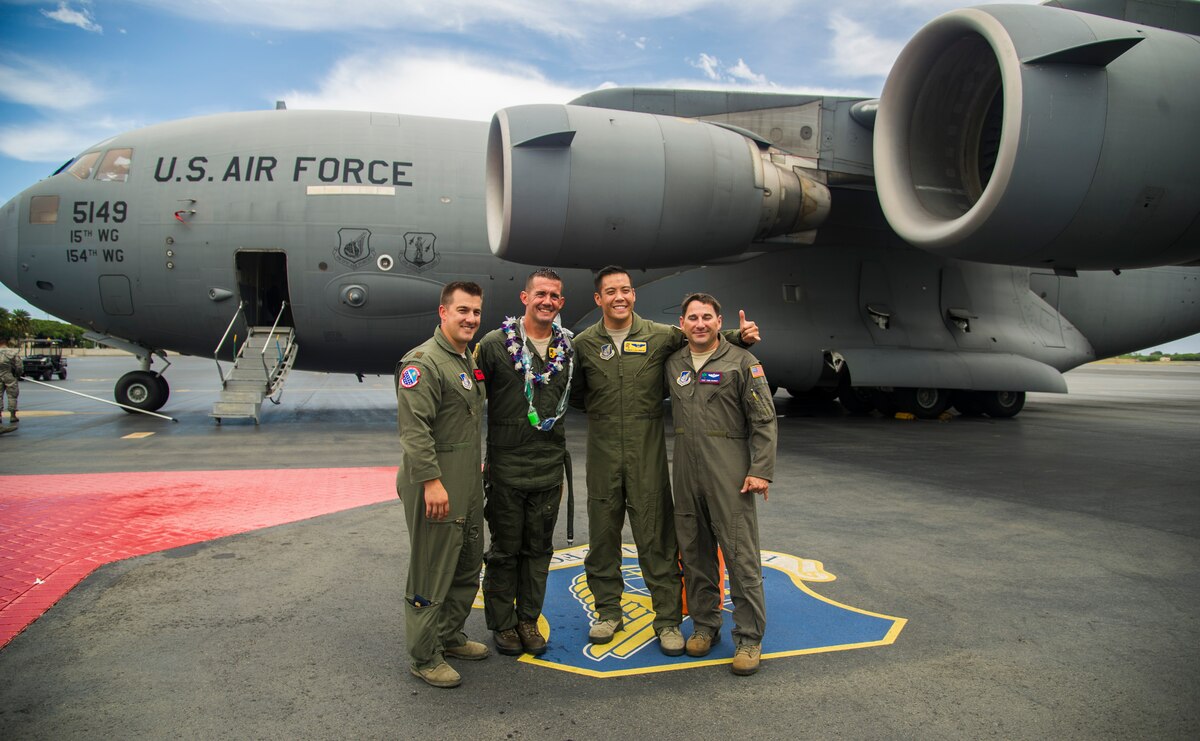 Maj. Justin Carmona, 535th Operations Support Squadron pilot, Col. Charles Velino, 15th Operations Group commander, Capt. Reinier Villanueva, 15th Operations Support Squadron C-17 flight instructor pilot, and Tech. Sgt. Todd Barney, 15th Operations Support Squadron loadmaster, pose for a photo after Velino’s final flight at Joint Base Pearl Harbor-Hickam, Hawaii, June 16, 2017. Velino is a command pilot with over 3,500 flying hours and will be leaving the 15th Operations Group to take command of the 47th Flying Training Wing in Laughlin AFB, Texas. (U.S. Air Force photo by Tech Sgt. Heather Redman)