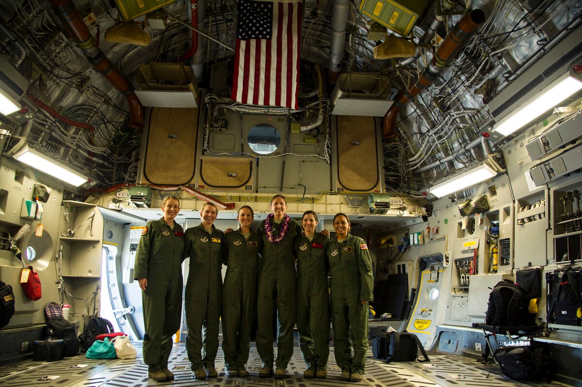 Maj. Jamilee Gunnels, Maj. Sean Perry, Maj. Brandee Taylor, Maj. Toni Merhar, Capt. Candi Piha, 535th Airlift Squadron C-17 Globemaster III pilots, and Tech. Sgt. Joleen Morse, 204th Airlift Squadron loadmaster, pose for a photo after an in-flight refueling mission, Joint Base Pearl Harbor-Hickam, Hawaii, April 25, 2018. The aircrew featured mothers to celebrate mothers who serve in the military and to highlight challenges Airmen face when balancing families and career. (U.S. Air Force photo by Tech. Sgt. Heather Redman)