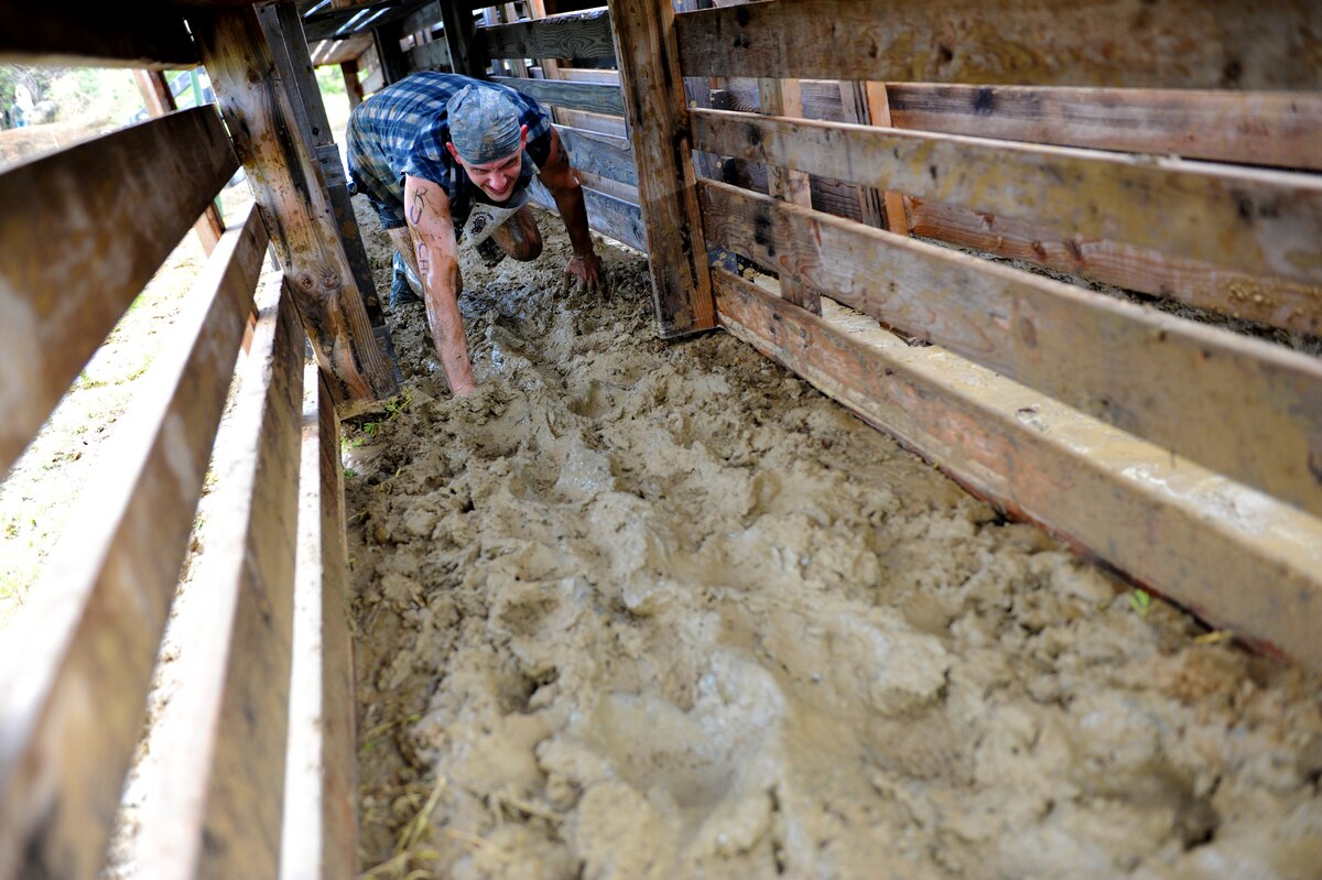 Tech. Sgt. Chris Gilmore, 647th Logistics Readiness Squadron, Joint Base Pearl Harbor-Hickam, Hawaii, low crawls through an obstacle during the Swamp Romp, a five-mile run through the mud along the Nu'upia ponds and down the Fort Hase Beach at Marine Corps Base Hawaii - Kaneohe Bay, Feb. 25, 2012. This unique anuual race, known as the "Dirtiest race in Hawaii," takes teams over and under the challenge-laden course that included unlimited mud, low crawling, jumping, climbing and falling in the mud. (U.S. Air Force photo/Staff Sgt. Mike Meares)