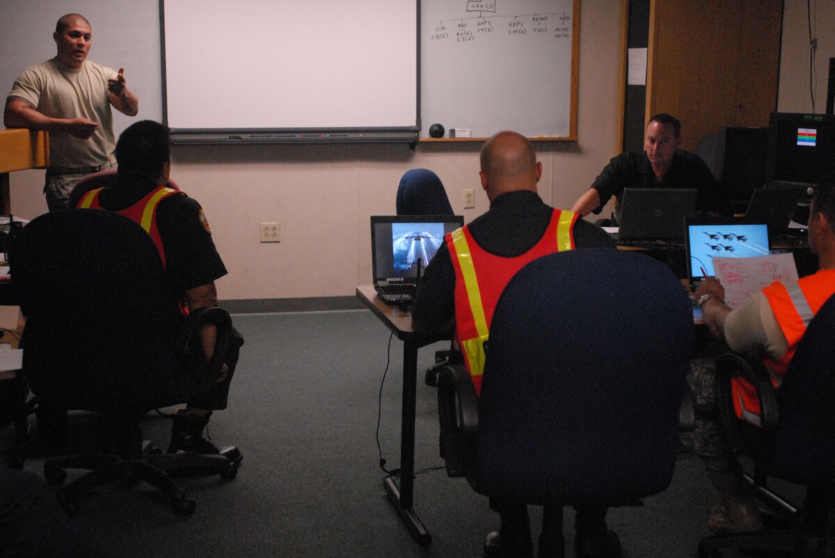 JOINT BASE PEARL HARBOR HICKAM, Hawaii - Tech. Sgt. Robert Laning, 312th Training Squadron DoD Fire Academy instructor at Goodfellow Air Force Base, Texas, briefs firefighters during a hotwash ofter completing a scenario on the Norma Brown trainer here, Jun 1. The Norma Brown trainer isa realistic situational training software used as part of a 12-day Fire Officer Two Course. The command and control training involved both the Hickam firefighters and Federal Fire Department Hawaii firefighters from Pearl Harbor. (U.S. Air Force photo/Senior Airman Gustavo Gonzalez)