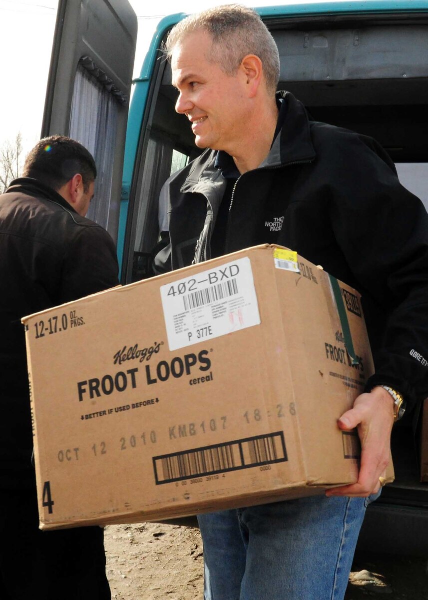 U.S. Air Force Lt. Col. Rex Vanderwood, 376th Expeditionary Mission Support Group deputy commander, and Air National Guard Tech. Sgt. Jake Mayo, 376th ELRS vehicle maintenance NCO in charge deployed from Birmingham, Ala., unload a box of humanitarian assistance items collected from stateside bases and friends to distribute to families in Manas Village, Kyrgyzstan, March 18, 2010. (U.S. Air Force photo/Staff Sgt. Carolyn Viss/released)