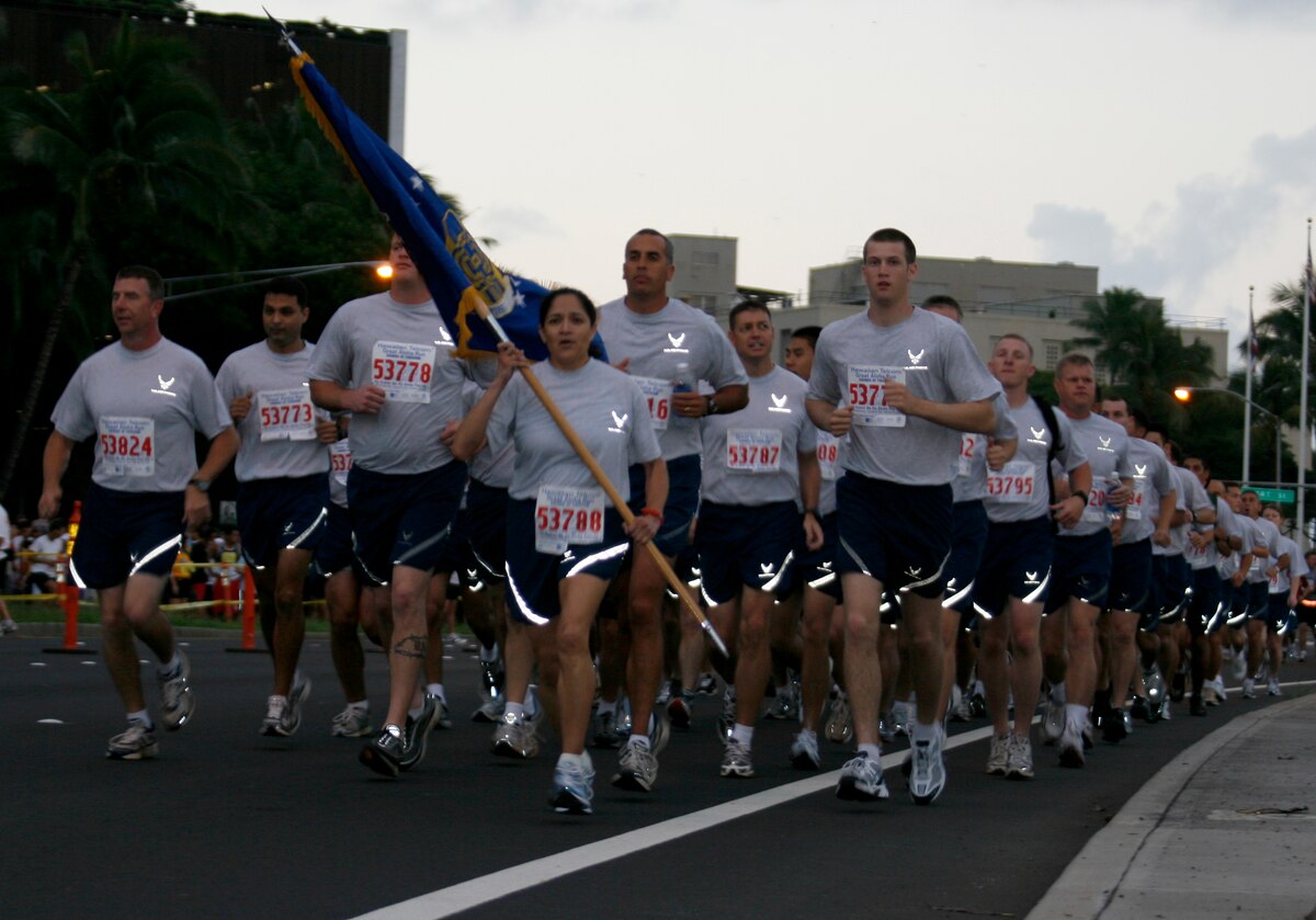 Master Sgt. Roxane Torres, 15th Airlift Wing, carries the guidon, leading the formation of Team Hickam runners from the Aloha Tower to Aloha Stadium during the annual Hawaiian Telecom Great Aloha Run, Feb. 18. Around 21,000 participants came out for the event. Photo by Staff Sgt. Erin Smith.