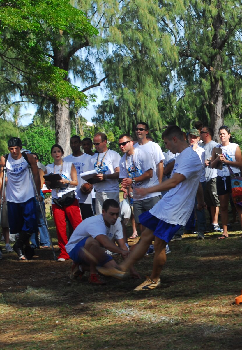 Air Force, the last NFL-sanctioned dynasty Published Feb. 12, 2008 By By Mark Munsey 15th Airlift Wing Public Affairs KAPIOLANI PARK, Hawaii -- At Friday's NFL Military Challenge, Team Hickam players made up the Air Force squad that again battled all-stars teams from the island's Army, Coast Guard, Marine and Navy contingents. And for the third year in a row, blue was the last color standing. "We've got the 40 next. Get warm." Nate Allen, AF NFLMC team captain and former Academy starting cornerback has the understandable cadence of a man not to be trifled with. It was the timing of his lock-it-down undertoned message that took non-military onlookers by surprise. After the first kicker. During the first event of the day. OK, it wasn't technically after the first kicker, more like his last attempt had just started its descent, but team mate Richard Good was doing the kicking, so Allen's faith in gravity was well founded. Last year, former Florida state soccer champion Good was the final place kicker, doing a rock-solid Larry Bird impression: everyone else was playing for second place. So it seemed odd that he led off this year's competition, like someone jumbled the lineup card and Sinatra was opening for the crappy magician, only without the sound check equivalent of a practice kick. The first note missed wide left, the next nine conversions played out like a fondly-remembered summertime jam. With opponent's 'miss' magic number at two, The Navy kicker eliminated himself in minimum time and the Army kicker did him only one better, done by the third attempt. The Coastie made it to seven missing his second try, and the Marine kept the suspense until his final swing before settling for second. The afore-mentioned team 40-yard dash was anchored by Marcus Fox, former college sprinting lead leg on four consecutive championship 4x100 relay teams at Claflin College, and team newcomer Winston Jackson - who would later demonstrate the difference between 'sprint' fast and 'receiver getting after a football downfield' fast. Bolting to their best time ever - 29.3 seconds, another NFLMC record seemed imminent but actually lasted for about two minutes. The Army immediately re-set the competition gold standard by shaving a full .02 off, taking mad dash honors at 29.28 seconds. With punting next, team boot Nate Angel seemed to have precious few surrounding him. Off-center yards are subtracted from the total. Already injured, the chamber of commerce central-casting mercurial trade winds were taking practice blasts anywhere but the winners circle. Fortunately, Angel is something of a kicking legacy himself: Click, click, boom. First two punts decent, the last jaw dropping. And it happened again. A pair of not overly long but only a little wide kicks totaled 44 yards. When Angel crushed his third punt - the oddly-comforting sound of athletic leathers smacking - it pushed Army Staff. Sgt. Shawn Grace past the point of pleasantries. "Thanks for the hope," he throated from the gallery, which sounds nice on paper but when factoring in tonal was clearly less so. Angel's combined 91-yard total was exceeded only by a 102-yard punt down from the Coast Guard. The long-snapping competition serves only two purposes: a reminder it's silly for grown men to hike a ball at between their legs at a target and it also allows one of the other teams to get a ton of cheap points. Done and done. Once again, the race was tight and it was coming down to air time. In the passing competition, points are awarded incrementally based on distance of reception. The common consensus is two-points at twenty yards a toss leaves only the receivers to blame. When Calvin Kirton felt the surging warmth of arm rotation muscle memory, the jail-break phrase came easy and strong: 'let's go three.' The rules mandate in order to keep the playing field level, the receiver flips the football to the QB before taking off. Receiver Jackson's was more over the shoulder toss, already in full stride by second step. Kirton did a one-step drop, dug his right front foot into the ground and started fast-twitching the calf. Dropping his shoulder at least 15 degrees deeper than any previous attempt, he uncoiled and let another laser-tight pass rotate into the clear blue skies over Diamond Head. Close to 40 yards later, Jackson's full extension and nimble feet helped avoid pancaking the Navy photographer who now felt unsafe at any distance. A dozen passes never touched ground as the AF scored a perfect thirty and wrapped up their third NFLMC in a row and fourth in five years.