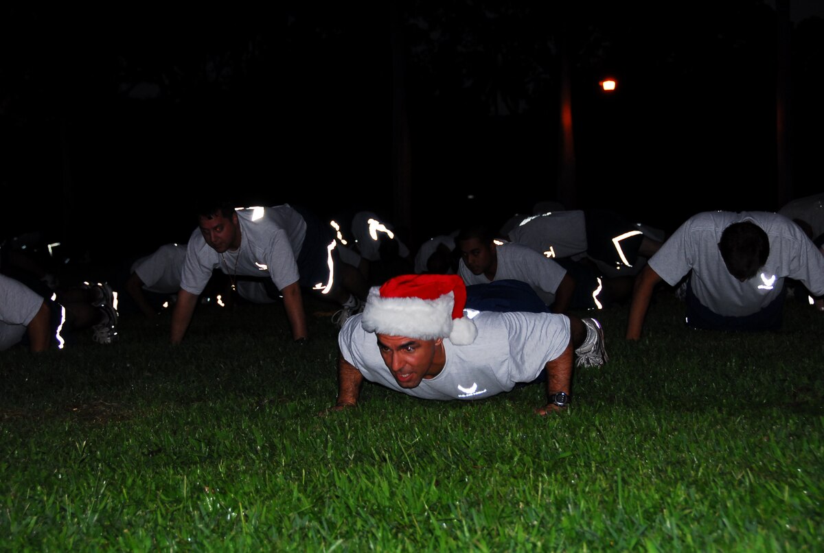 Col. J.J. Torres, 15th Airlift Wing Commander, leads Team Hickam members through push-ups and sit-ups before starting the run. The Team Hickam Warrior Run is a monthly 3-mile fun-run, designed to boost camaraderie between Hickam members. Photo by Ed Foster.