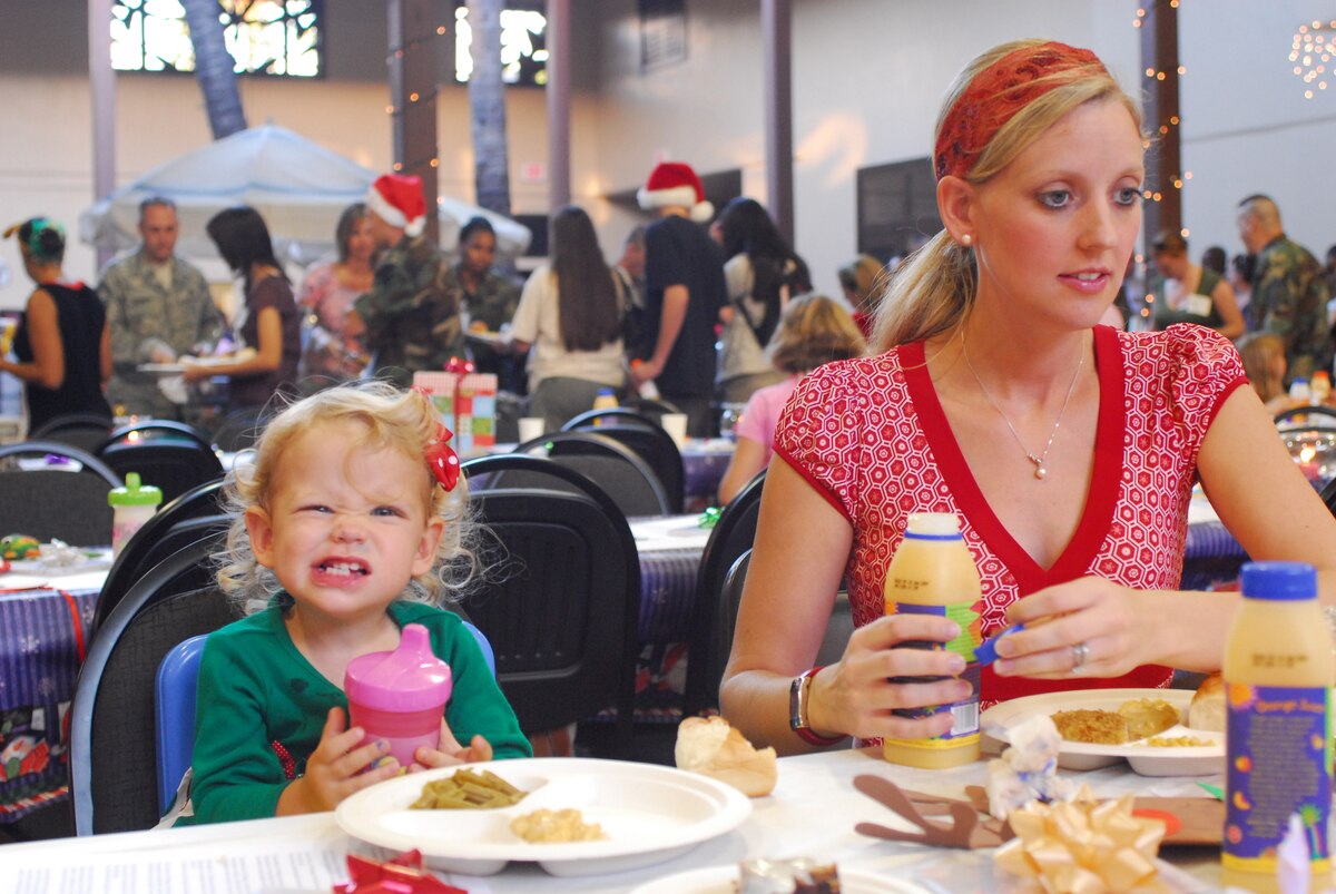 Aurora and daughter Isabella Baty the family of Senior Airman Michael Baty 15th Maintenance Squadron deployed to Southwest Asia, eat dinner at this month’s Airman Family Readiness Center Heart’s Apart Holiday party, Wednesday evening, Dec. 12, 2007.