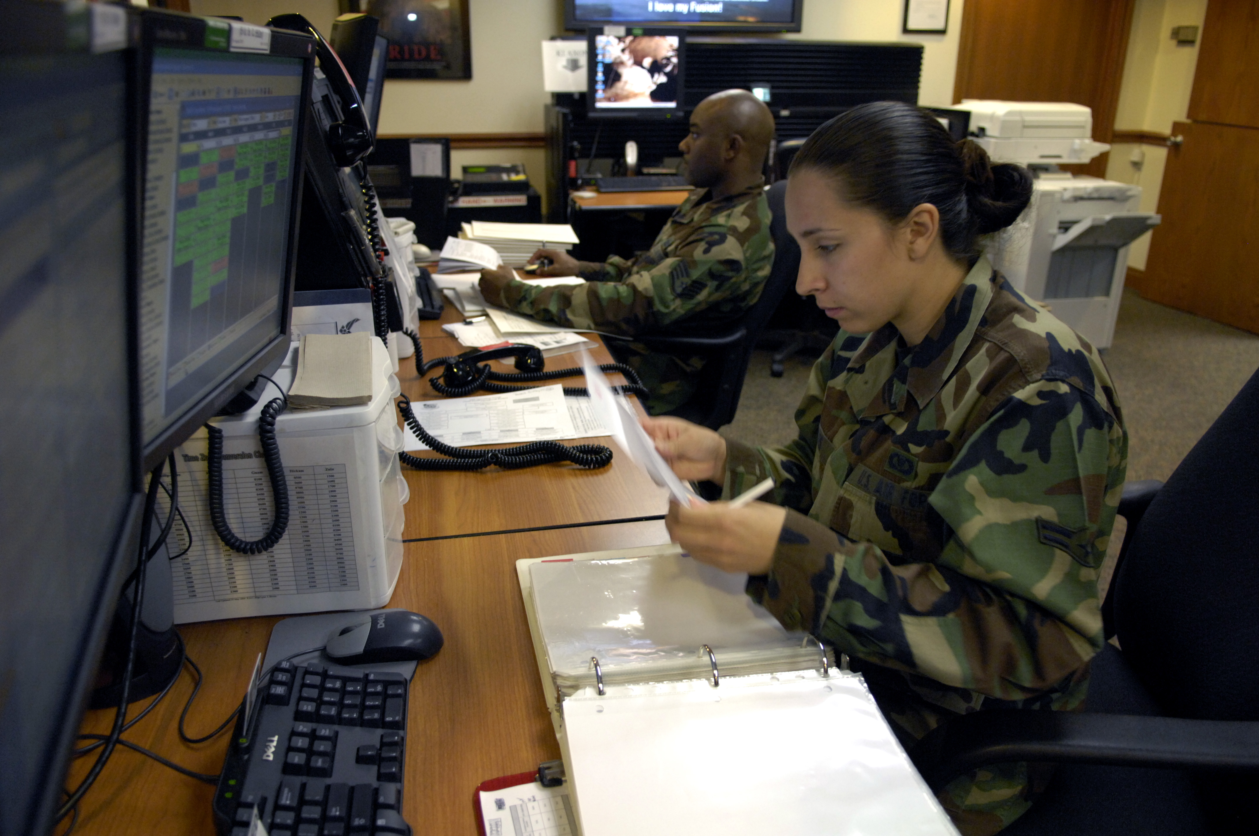Airman 1st Class Brenda Davis and Staff Sgt. Lynn Brown work at their control consoles inside the command post at Hickam Air Force Base, Hawaii 8 June 2007. The Airmen are emergency actions controllers from the 15th Airlift Wing. (U.S. Air Force photo/ Tech. Sgt. Shane A. Cuomo)