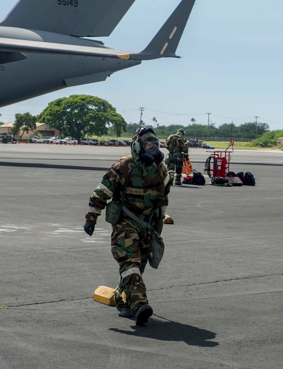 Tech. Sgt. Ty Tanaka, left, and Tech. Sgt. Jim Willard, both 154th Aircraft Maintenance Squadron C-17 Globemaster III specialists, practice drinking water from a canteen while in mission oriented protective posture 4 during a chemical, biological, radiological, nuclear and high-yield explosive exercise on Joint Base Pearl Harbor-Hickam, Hawaii, Nov. 7, 2014. Throughout the exercise, Airmen were tested on their ability to continue their mission after donning MOPP gear, conduct post attack reconnaissance sweeps, react to alarm signals, decontaminate equipment and administer self-aid and buddy care. (U.S. Air Force photo by Tech. Sgt. Terri Paden)
