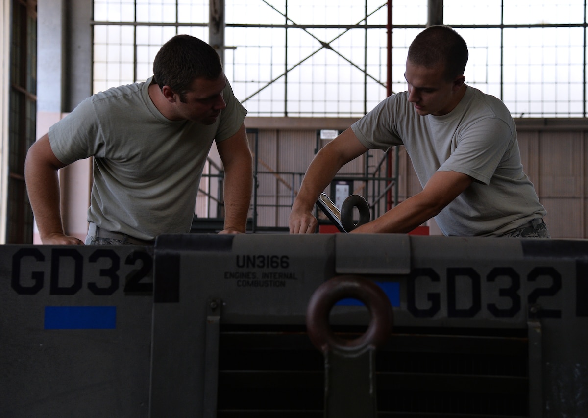 Staff Sgt. Joel Morris and Senior Airman Colton Russell, 15th Maintenance Squadron C-17 Globemaster Aerospace Ground Equipment, put final touches on a newly repaired power cart generator at Joint Base Pearl Harbor-Hickam, Hawaii, July 28, 2014. Morris, Russell and the rest of the AGE flight have been working hard to ensure their aircraft, as well as visiting aircraft for Rim of the Pacific 2014, have what they need while on the ground. RIMPAC is the world's largest maritime exercise, and comprises 22 nations operating around the Hawaiian Islands and Southern California to foster and sustain cooperative relationships that are critical to ensuring the safety of sea lanes and security on the world's oceans. (U.S. Air Force photo by Staff Sgt. Alexander Martinez)