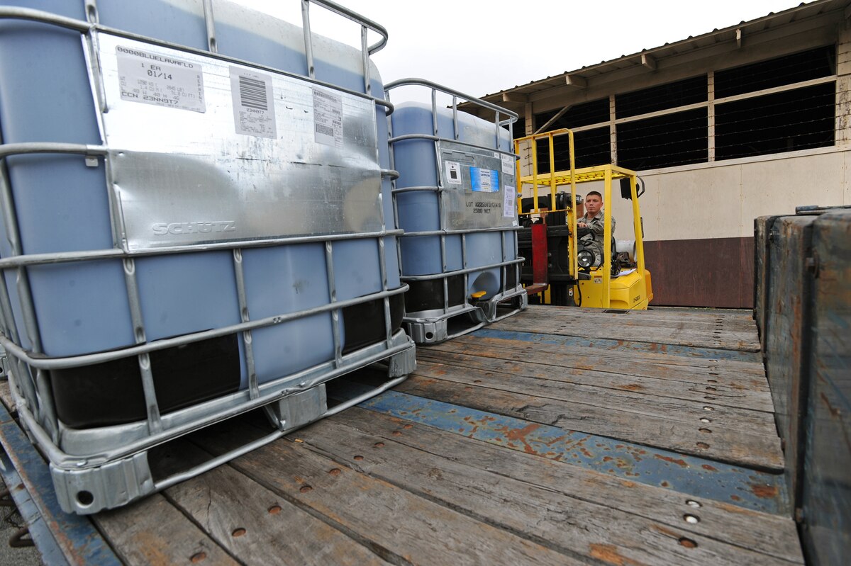 Airman First Class Erik Chapman, 647th Logistics Readiness Squadron vehicle operator, left and Walter Simmons, 647th LRS Travel Management Office Outbound Section, verify the manifest for cargo after loading it aboard a 40-foot flatbed trailer at the 647th Travel Management Office on Joint Base Pearl Harbor-Hickam, Hawaii, Feb. 14, 2014. On an annual basis, the 647th LRS moves more than 19,000 passengers, 7,294 short tons of cargo, 2,500 personal property shipments, and processes an excess of 215,000 supply transactions. (U.S. Air Force photo/Master Sgt. Jerome S. Tayborn)
