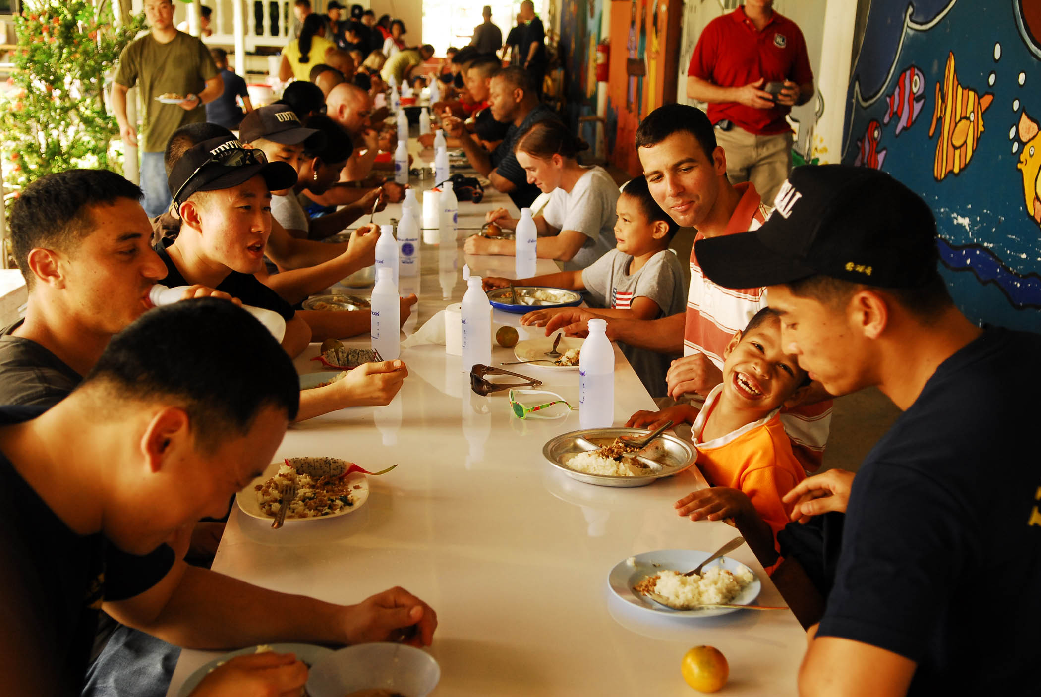 Members of the U.S. Army and Air Force, as well as Republic of Korea Marine Corps and Navy personnel, eat lunch with residents of an emergency center for small children in Pattaya, Thailand, during a joint military community relations project Jan.30. The servicemembers played with the children, attended a lunch cooked by the center's personnel, and landscaped the area. The visit was part of Exercise Cobra Gold 2010. (U.S. Marine Corps Photo/Cpl. Jovane M. Holland)